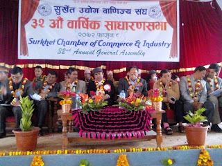 यस्तै महासंघका केन्द्रीय सदस्यहरू निरक केसी, टेकबहादुर भण्डारी, मध्यपश्चिम क्षेत्रीय उद्योग वाणिज्य संघका अध्यक्ष पदमबहादुर शाही, मप क्षेत्रीय प्रशासन कार्यालयका उप–प्रशासक नारायण सापकोटा, मप विश्वविद्यालयका रजिस्ट्रार डा. महेन्द्रकुमार मल्ल, विभिन्न राजनीतिक दलका प्रतिनिधिलगायतले जिल्लाको आर्थिक विकासमा निजी क्षेत्रको भूमिका महŒवपूर्ण रहेको बताए । साथै उनीहरूले सुर्खेत लगानी वर्षलाई सफल बनाउनका लागि सबैको सहयोग आवश्यक रहेकोमा समेत जोड दिए । सो अवसरमा महासचिव गोपालकृष्ण गिरीले प्रगति प्रतिवेदन र कोषाध्यक्ष दीपेन्द्र ढकालले आर्थिक प्रतिवेदन प्रस्तुत गरेका थिए ।