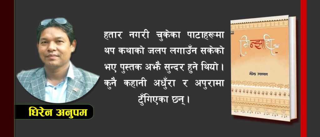 एउटा गजलकार गजल लेखनीबाट हँुत्तिदै आख्यान क्षेत्रमा पुग्नु सामान्य कुरा पनि होइन । अन्य गजलकारहरूलाई महेन्द्र उपाध्यायको आख्यान क्षेत्रको उफ्राइप्रति चाँसो र जिज्ञासा लाग्नु स्वभाविकै हो । गजल लेख्ने सायरले आख्यान कस्तो लेख्यो भन्ने प्रश्न उठ्नु अन्यथा होइन । म पनि कुतुहल र जिज्ञासाको घेराबाट अछुतो रहन सकिनँ । मिन्झारी जब हातमा प¥यो, मैले पनि एकसुरमा पढिरहेँ । खाना खान भुलँे । पानी पिउन भुलेँ मिन्झारी नसकुञ्जेल । मिन्झारीको अर्थ पढेपछि थाह पाएँ । थारु समुदायको बाघरूपी कुलदेवता बस्ने खोपी रहेछ । बाघ रमाउने रगतमा हो तर मिन्झारीको बाघ रगतमा नभइ गाइको दूधमा रमाउने रहेछ । पर्वतिया÷पहाडीलाई मिन्झारीको बाघ मानेर पुजा गर्ने पहाडियाबाट भूमीपुत्र थारुहरू शोषित, उत्पीडित हुनुको पीडा लेखकले ओकल्न खोजेका छन् तर यस्तो गम्भीर विषयमाथी लेखक पेचिलो रूपमा उभिएर कहानीको खोजी अझै गरेको भए उपन्यासले युगको प्रतिनिधित्व गर्नेथियो ।