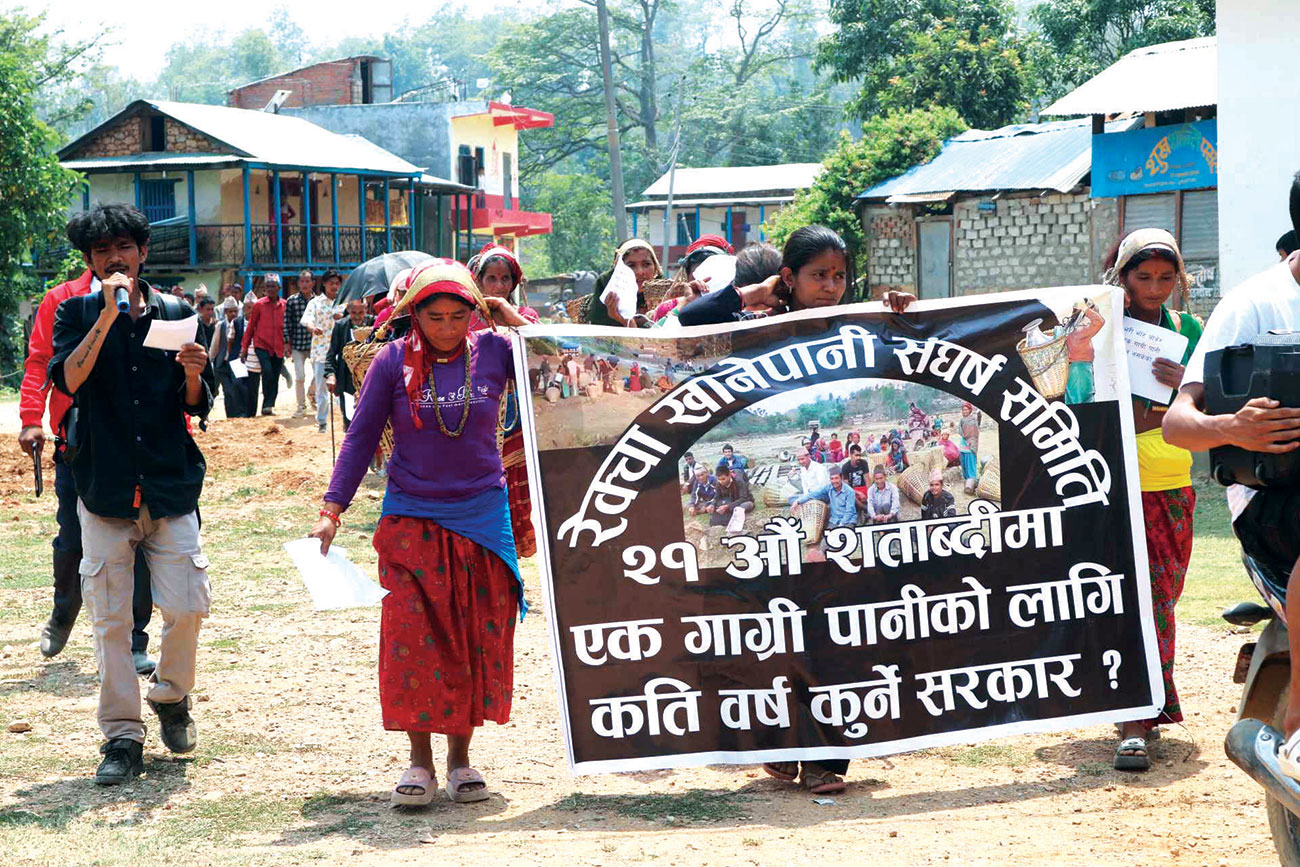 वर्षौंदेखि खानेपानीको चर्को अभाव भोग्दै आएका रेक्चाका नागरिकले बिहीवार विरोधस्वरूप गाउँपालिका कार्यालय घेराउ गरेका हुन् । खानेपानी समस्या समाधानको आश्वासन मात्रै दिएको भन्दै स्थानीयवासीले पालिकामा पुगेर आन्दोलन गरेका हुन् । रेक्चाका विभिन्न टोलका झण्डै ५० घर परिवारका मानिसहरूले डोकोमा गाग्री बोकेर पालिका कार्यालय पुगेका थिए । सरकारले कुनै चासो नदिएकोले प्रदर्शन गरिएको स्थानीय तपेन्द्र बिसीले बताए । २०१६ सालमा बनाइएका कुवा सुकेपछि स्थानीयहरू पानीको माग गर्दै सरोकारवाला निकायसमक्ष पुगे पनि सुनुवाइ नभएको उनीहरूले जनाएका छन् ।