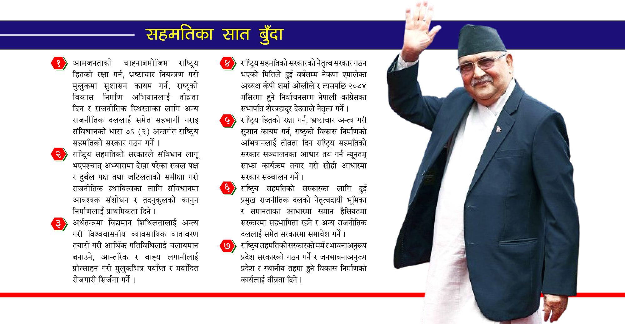 ४. राष्ट्रिय सहमतिको सरकारको नेतृत्व सरकार गठन भएको मितिले दुई वर्षसम्म नेकपा एमालेका अध्यक्ष केपी शर्मा ओलीले र त्यसपछि २०८४ मंसिरमा हुने निर्वाचनसम्म नेपाली कांग्रेसका सभापति शेरबहादुर देउवाले नेतृत्व गर्ने ।