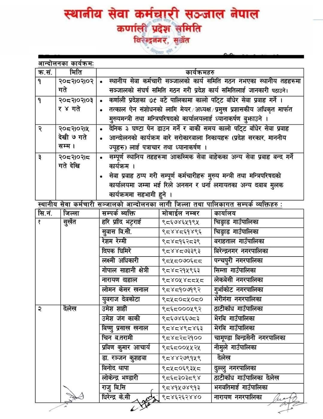 त्यसैगरी जेठ ५ गतेदेखि ७ गतेसम्म दैनिक तीन घण्टा पेन डाउन गर्ने र बाँकी समयमा कालोपट्टी बाँधेर सेवा प्रवाह गर्ने, सोही अवधिमा प्रदेश सरकार र प्रदेशसभा सदस्यहरूलाई पत्रचार तथा ध्यानाकर्षण पत्र बुझाउने र माग पूरा नभए जेठ ८ गतेदेखि आकस्मिक बाहेकका सबै सेवाहरू ठप्प पारेर मुख्यमन्त्री तथा मन्त्रिपरिषद्को कार्यालयमा रिले अनसन र धर्ना दिने कार्यतालिका तय गरिएको छ ।