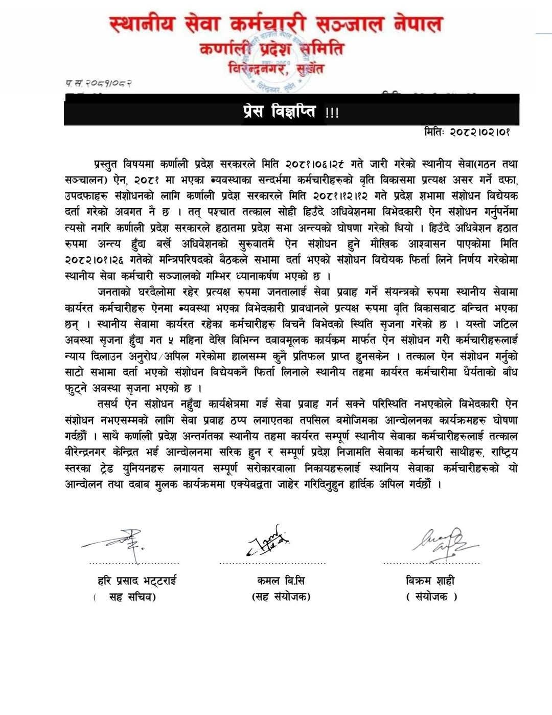 सुर्खेत: कर्णाली प्रदेश सरकारले संसद्मा टेबुल भइसकेको स्थानीय सेवाको गठन तथा सञ्चालन ऐन–२०८१ लाई संशोधन गर्न बनेको विधेयक फिर्ता लिएपछि स्थानीय तहमा कार्यरत कर्मचारीहरूले आन्दोलन घोषणा गरेका छन् । स्थानीय सेवा कर्मचारी सञ्जाल कर्णाली प्रदेश समितिले बिहीवार प्रेस विज्ञप्ति जारी गर्दै आन्दोलनको घोषणा गरेको हो ।