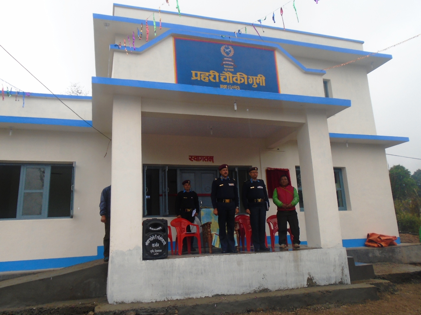 गुमीमा निर्माण भएको प्रहरीचौकी भवनको बुधवार उद्घाटन गर्दै मध्यपश्चिम क्षेत्रीय प्रहरी कार्यालय सुर्खेतका प्रहरी नायव महानिरीक्षक केशव अधिकारीले आफ्नै भवन नहुँदा सुरक्षामा खटिएका प्रहरी आफै असुरक्षित रहेको बताए । उनका अनुसार द्वन्द्वमा सबैभन्दा बढी प्रभावित मध्यपश्चिम क्षेत्रमा अहिले पनि एक सय २१ वटा प्रहरीचौकी भाडाको घरमा बस्दै आएका छन् । भाडाको घरमा प्रहरीले कष्टकर जीवन बिताउनु परेको बताउँदै अधिकारीले भने, ‘द्वन्द्वमा ध्वस्त भएका चौकीको अवस्था नाजुक छ, प्रहरीहरू आफै सुरक्षित छैनन् । यस्तो अवस्थामा उनीहरूले जनतालाई कसरी सुरक्षा देलान् ? तर पछिल्लो समय चौकीका आफ्नै भवन बन्नेक्रम सुरु भएकाले केही राहत मिलेको छ ।’ ध्वस्त चौकीहरू पुनर्निर्माण हुन थालेको भन्दै उनले अब प्रहरीको कार्यक्षमतामा पनि वृद्धि हुने विश्वास व्यक्त गरे । स्थानीय बासिन्दाले चौकी निर्माण र जग्गा प्रदान गर्न थालेको बताउँदै अधिकारीले जनता र प्रहरी मिलेमा अपराध नियन्त्रणमा सफलता मिल्ने बताए । साथै उनले सुरक्षामा खटिएका प्रहरीलाई समेत आचरण विपरित कार्य गरेमा कडा कारबाही गर्ने चेतावनी दिएका छन् । सो अवसरमा सुर्खेतका प्रहरी प्रमुख एसपी वीरेन्द्र श्रेष्ठले जिल्लामा ध्वस्त भएका अन्य प्रहरीचौकीका भवनहरू पनि निर्माणको चरणमा रहेको जानकारी दिए ।