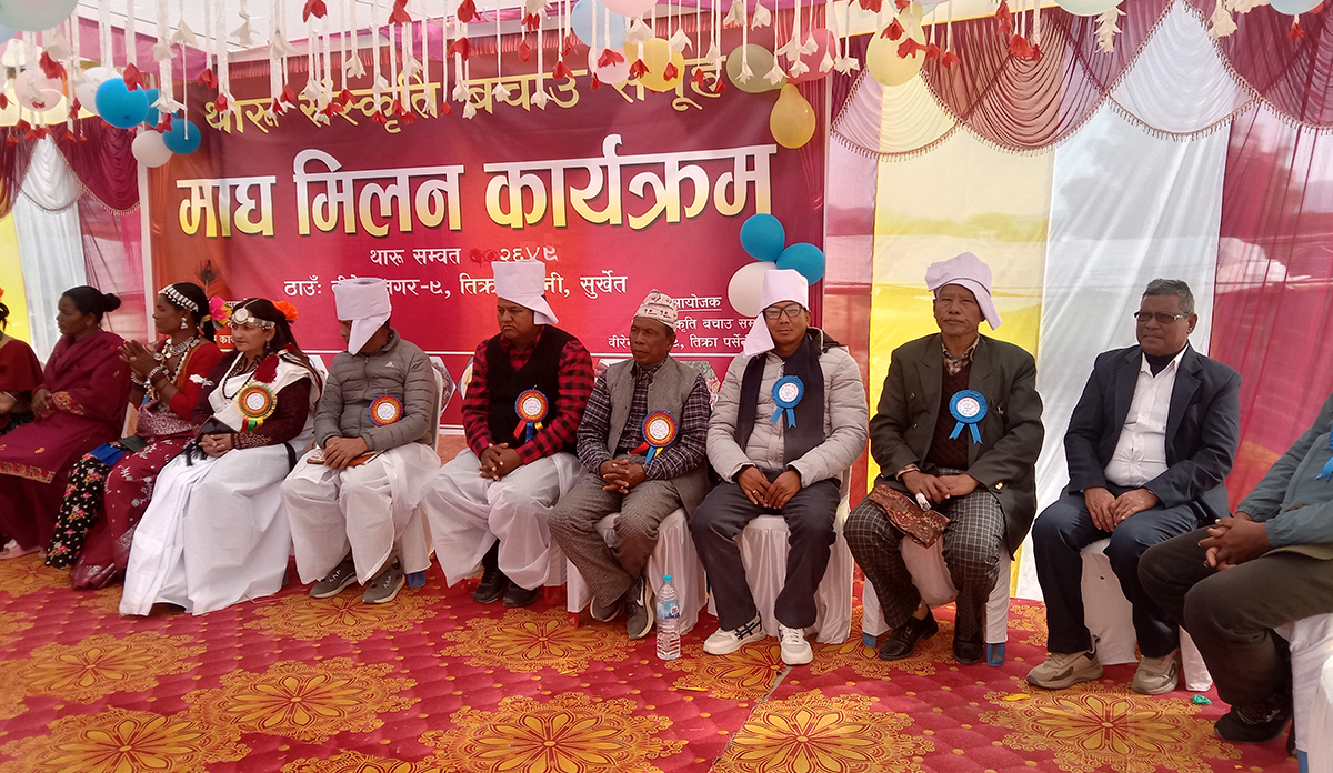 लखागिन थारु उत्थान मञ्च, सुर्खेतके अध्यक्ष मानबहादुर चौधरी पन्ना–सबसे लग्घक सरकार वडा सरकार ओ नगर सरकार हो । वीरेन्द्रनगर नगरपालिकाम बैसल थारुने भावना विपरीत वडास्तरम कार्यक्रमके बजेट विनियोजनभन्दा समग्रम जिल्लाबासी समेट्ख माघ पर्वके उत्सव मनाइपर्ना जरुरी बा । यकर लाग नगर ओ वडासे सहयोगके वातावरण बनाइ पर्ना काम जनप्रतिनिधि ओ थारु अगुवा लाग पर्ना सुझाव डेल । माघक मुल मर्म सबजहन एक्क ठाउँम सिम्वाट पर्नाम भिन्न भिन्न गाउँम भिन्न भिन्न तौरतरिकासे मनैना मैगर ओ सैगर बन निसेक्लक बाट ढर्ल ।