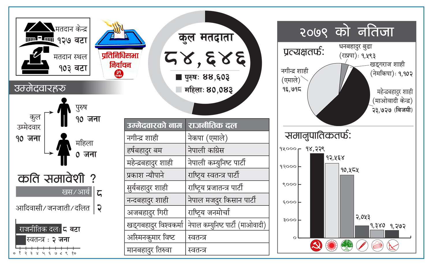 महेन्द्रबहादुर शाहीले कालीकोटबाट तीन पटक चुनाव जितिसकेका छन् । २०७० र २०७९ मा संघीय चुनाव जितेका उनले २०७४ मा भने प्रदेशसभामा निर्वाचित भएका थिए । लगातार शाहीले मात्रै अवसर पाएको भन्दै अहिले नेकपाभित्र विवाद देखिएको छ । शाहीविरुद्ध नेकपाकै अर्का नेता जीवनबहादुर बुढाले स्वतन्त्र उम्मेदवारी दर्तासमेत गराएका थिए । तर उनले अन्तिम समयमा आफ्नो उम्मेदवारी फिर्ता लिएका छन् । बुढाले उम्मेदवारी फिर्ता लिए पनि नेकपाभित्र देखिएको यो असन्तुष्टी शाहीका लागि भने भारी पर्न सक्नेछ ।