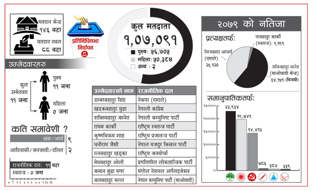 प्रतिनिधिसभामा मात्रै होइन प्रदेशसभाको समानुपातिक मतमा पनि माओवादी केन्द्र तेस्रो भएको थियो । योभन्दा अघि एमाले र कांग्रेस थिए । यस हिसाबले पनि एक्ला एक्लै चुनाव लड्दा नेकपाका उम्मेदवार बस्नेतले जित निकाल्न सहज हुने छैन । यद्यपि, एमालेबाट फुटेर बनेको एकीकृत समाजवादीसँगको एकताले भने केही फाइदा पुग्न सक्नेछ । तर जाजरकोटमा समाजवादी पनि कमजोर नै थियो । गत चुनावमा समानुपातिकतर्फ समाजवादीले सात सय ८६ मत मात्रै पाएको थियो ।