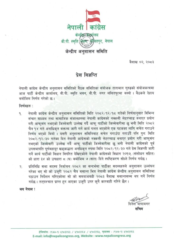 कांग्रेस सभपाति थापाले सबैलाई वडा–वडामा पुगेर सदस्यता अद्यावधिक गर्न निर्देशन दिएका थिए । त्यसअघि उनले सबैको सदस्यता खारेज भएको बताएका थिए । त्यसको विरोध गर्दै खड्काले गत चैत ३० मा विज्ञप्ति जारी गरेका थिए । त्यसअघि पनि खड्काले कार्यवाहक सभापतिको रूपमा विज्ञप्ति जारी गरेको भन्दै कांग्रेसले सचेत गराएको थियो । सचेत गराउँदा पनि कार्यवाहक सभापति भनेरै विज्ञप्ति जारी गरेपछि कारबाहीको प्रक्रिया अघि बढाएको हो ।