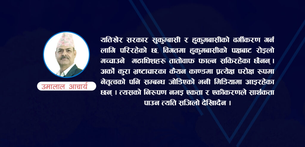 यतिखेर सरकार सुकुम्बासी र हुकुमबासीको वर्गीकरण गर्न लागि परिरहेको छ, विगतमा हुकुमबासीको पक्षबाट रोइलो मच्चाउने मठाधिशहरू तातोवाफ फाल्न सकिरहेका छैनन् । अर्को कुरा भ्रष्टाचारका कैयन काण्डमा प्रत्येक्ष परोक्ष रूपमा नेतृत्वको पनि सम्बन्ध जोडिएको भनी मिडियामा आइरहेका छन् । त्यसको निरूपण नभइ एकता र एकीकरणले सार्थकता पाउन त्यति सजिलो देखिँदैन ।